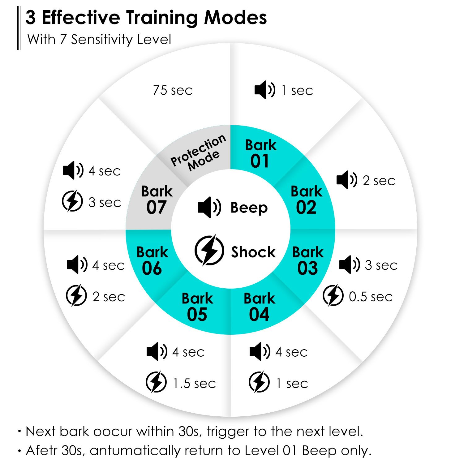 ** Effective Bark Control Training*:The bark control collar including warning sound 'Beep' and gentle electric shock. One training cycle includes the two modes of 7 sensitivity levels. When the dog continuously barks(within 30s after last trigger),the duration of warning sound and electric shock will gradually lengthen to train the dogs. The sensitivity level is adjustable as you needs.